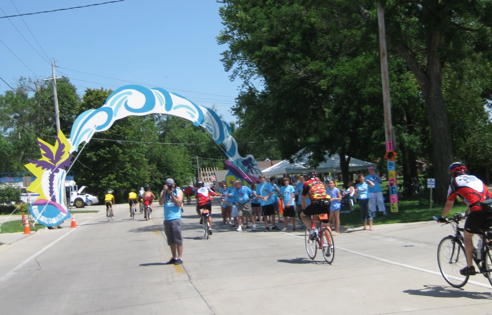 Tuesday, Heather and I completed our first day of Ragbrai ever! The 60 mile route was from Algona to Clear Lake. My dad knows a couple who lives in Algona, Noel and Amy were gracious enough to let us sleep in their basement Monday night...big thanks! Tuesday morning, we started off at the crack of dawn, 6 am, to try and beat the heat!